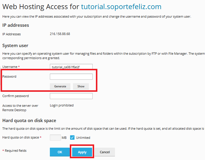 6) Una vez cambiada y confirmada la nueva contraseña no hay que olvidarse de pulsar sobre el botón azul de “Aceptar” o “Aplicar” para que se establezca esa nueva contraseña para el acceso FTP, ya que de lo contrario no se aplicaría.