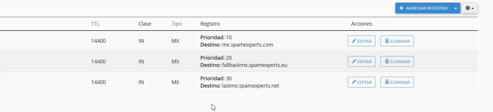 Paso 3: Se agregan Los MX necesarios para que el servicio de SpamExperts empiece a funcionar