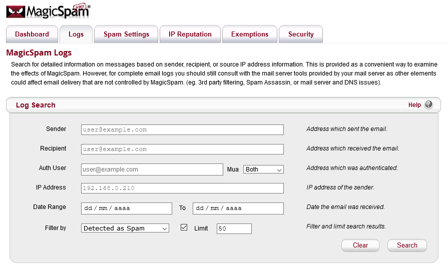 - Cada mensaje se registra aquí y se verá lo MagicSpam marcó como “SPAM” y lo que se entregó en los buzón de correo (etiquetado como “HAM”).