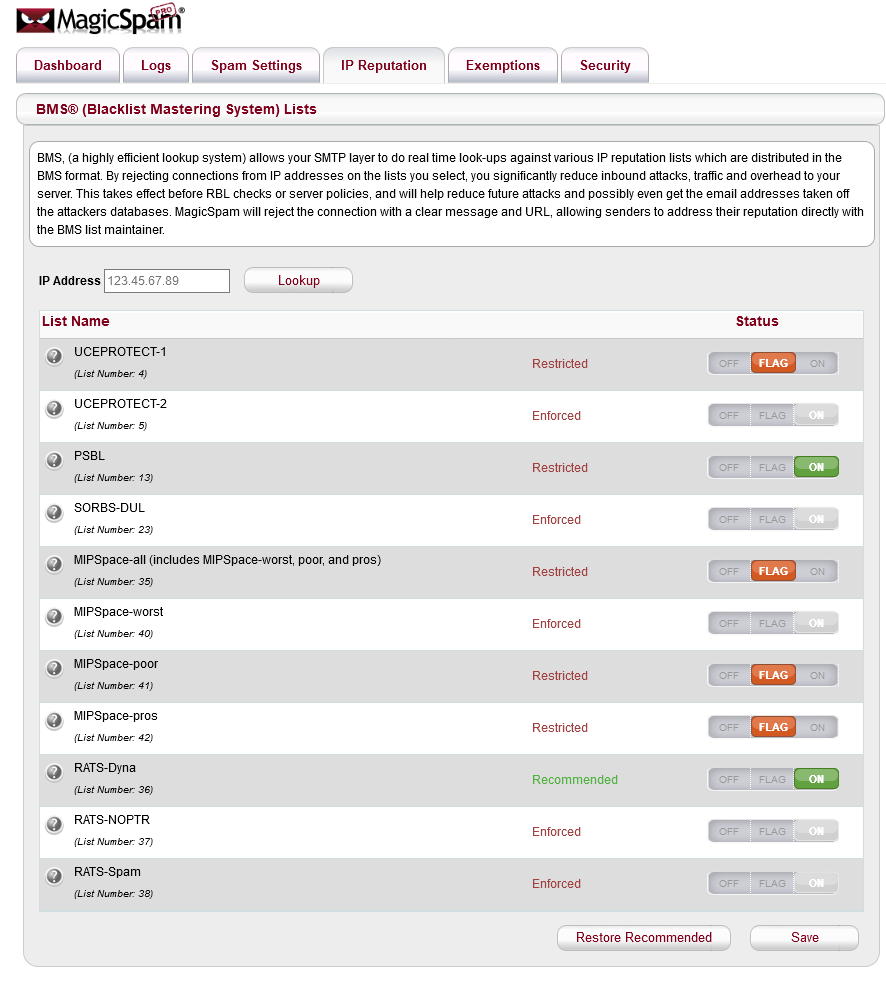 BMS permite hacer búsquedas en tiempo real de varias listas de reputación IP distribuidas en formato BMS. Al rechazar conexiones de direcciones IP de las listas que seleccione, reduce ataques entrantes, tráfico y sobrecarga en su servicio. Esto se lleva a cabo antes de hacer comprobaciones RBL o políticas de servidor, y ayudará a reducir futuros ataques.