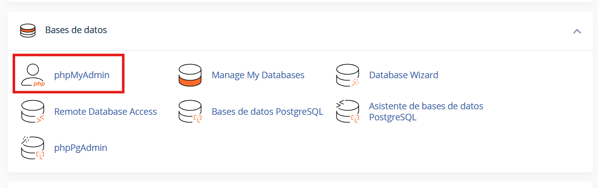 1. Acceda al panel de control cPanel y localice el icono de phpMyAmin