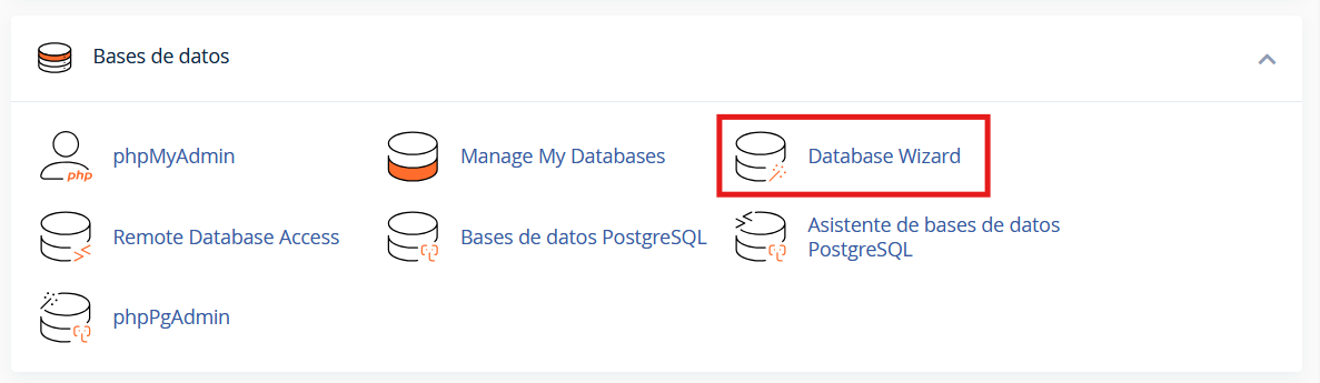 2. Ubique la sección relacionada con las bases de datos, y haga clic en «Asistente de bases de datos MySQL»