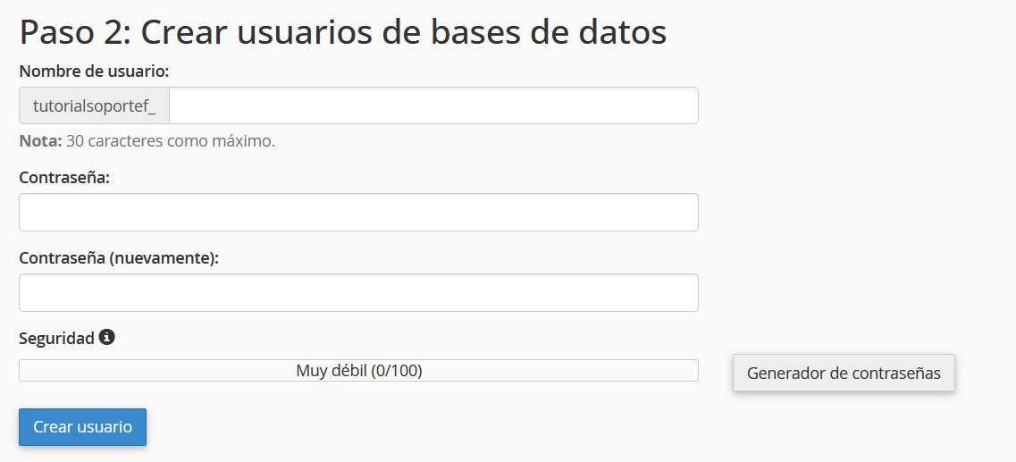 4. Ahora en el paso 2, se creará el usuario de base de datos, para ello pedirá un nombre y contraseña, luego de completados pulse «Crear usuario».