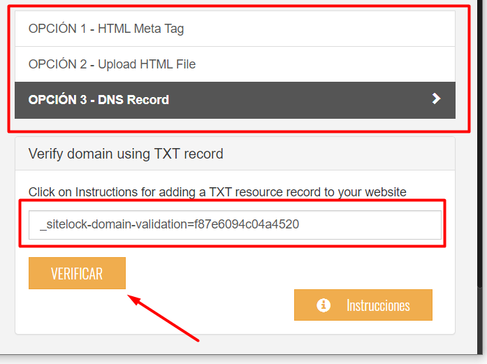 10.- Escogemos el método de validación el más rápido y fácil, seguimos los pasos y agregamos los registros indicados en el dominio y damos clic en verificar.